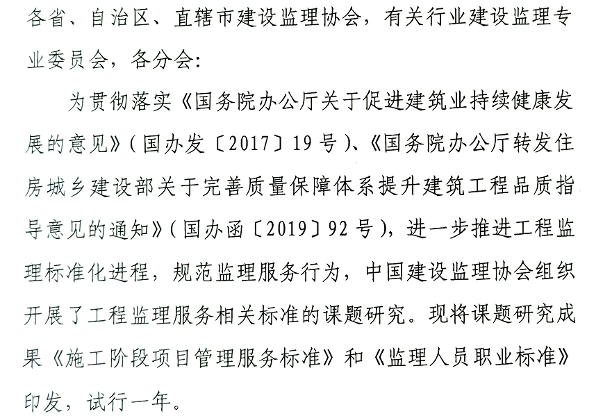 近日,中國(guó)建設(shè)監(jiān)理協(xié)會(huì)官網(wǎng)印發(fā)試行《施工階段項(xiàng)目管理服務(wù)標(biāo)準(zhǔn)》和《監(jiān)理人員職業(yè)標(biāo)準(zhǔn)》的通知。