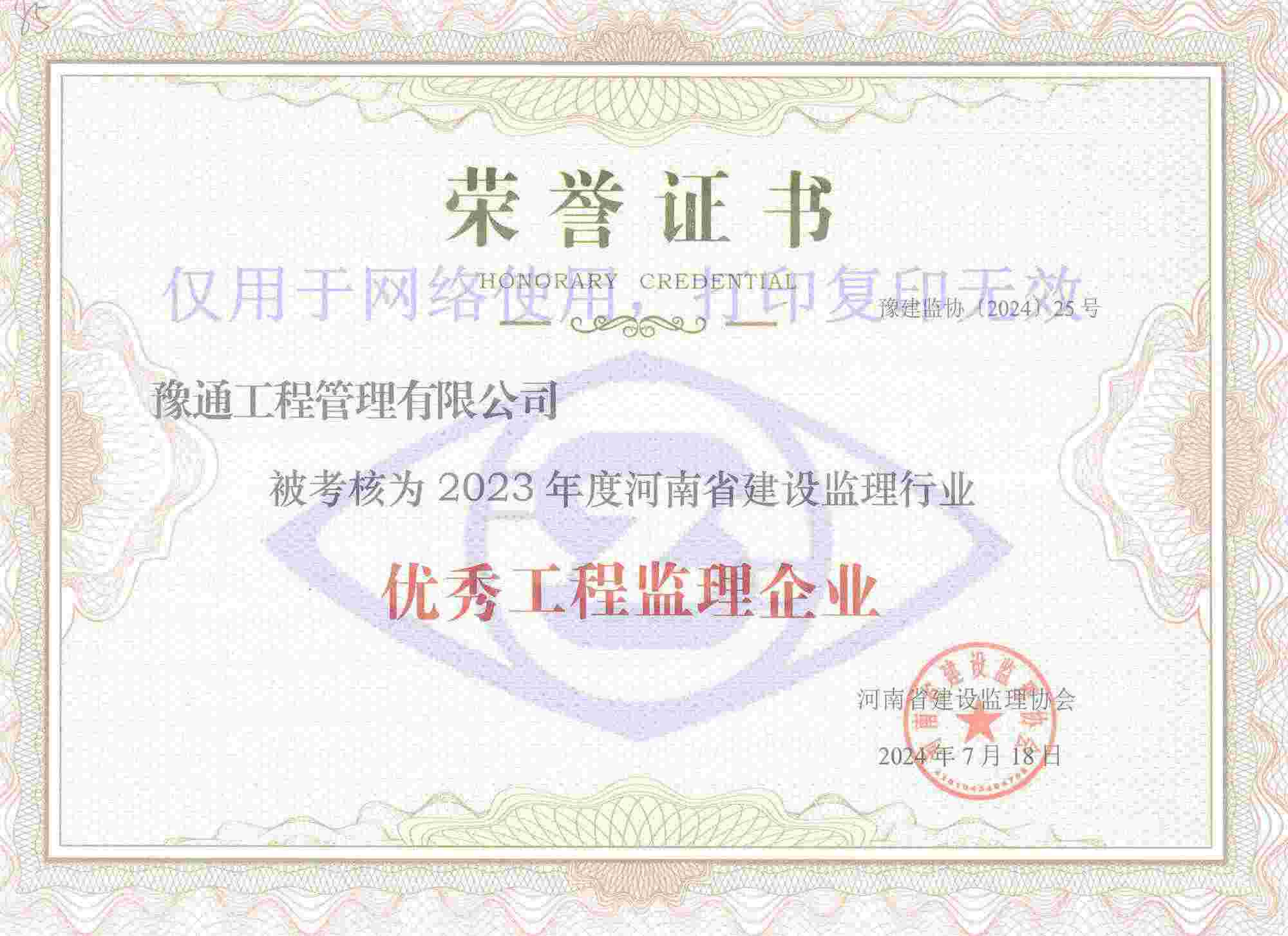 近日,河南省建設(shè)監(jiān)理協(xié)會發(fā)布了關(guān)于公布2023年度會員單位考核結(jié)果的通知(豫建監(jiān)協(xié)〔2024〕25號),我公司榮獲“2023年度優(yōu)秀工程監(jiān)理企業(yè)”稱號。