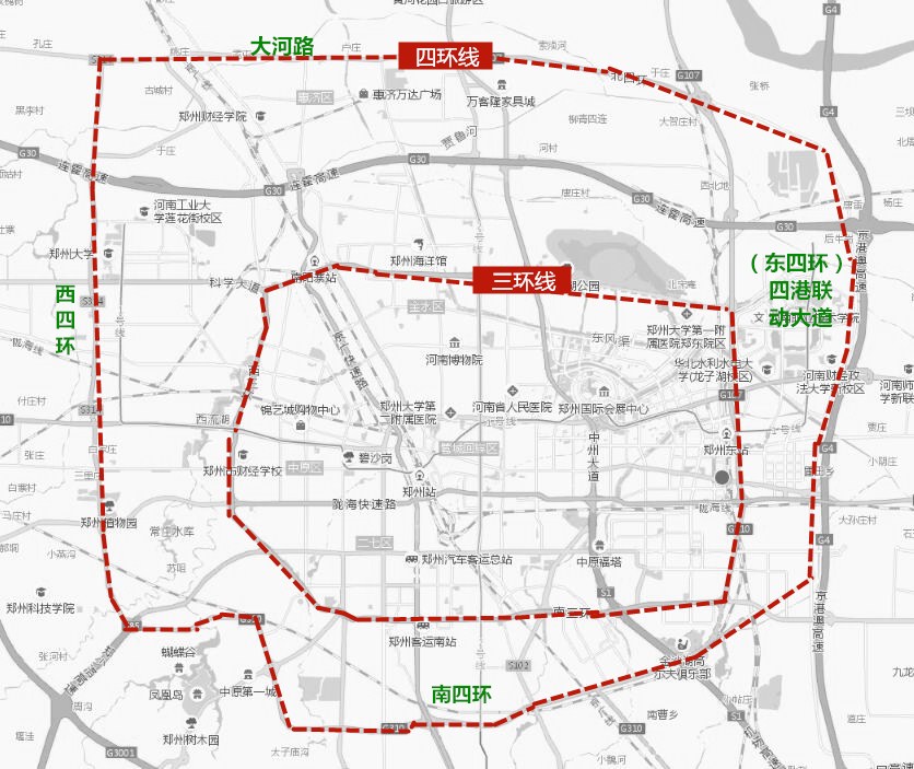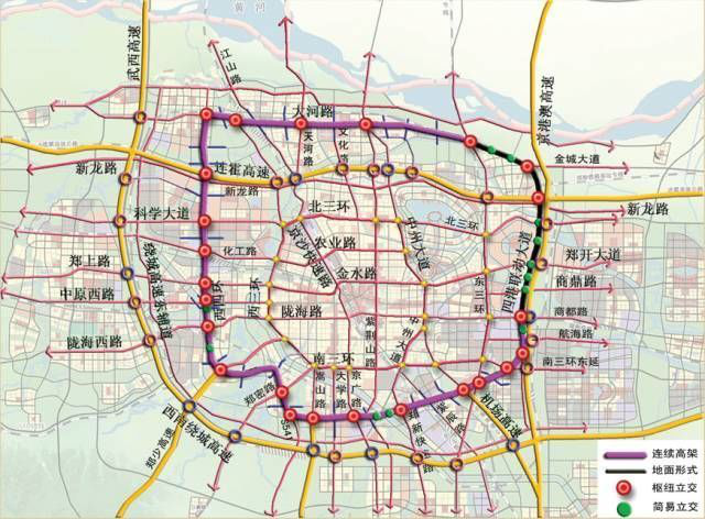 鄭州市四環線及大河路快速化工程為由大河路、東四環、南四環及西四環組成閉合環線,路線全長約93.030km。全線采用城市快速路路標準,規劃控制總寬度180m(其中道路紅線寬80m,兩側各有50m寬綠化帶),西西四環、大河路(107輔道以西段)、南四環采用高架快速路形式,標準橫斷面組成為:高架快速路(雙向八車道)+地面主干路(雙向八車道)+輔路:大河路(107輔道以東段)、東四環采用地面快速路形式,標準橫斷面組成為:主線地面快速路(雙向十車道)+輔路。全線高架快速路長63.624km(新建56.536km,現狀7088km),地面快速路長29.406km;共設置27座互通立交,其中新建立交15座(改造現狀立交7座,利用現狀立交5座),37對上下匝道,8座隧道(下穿通道);全線與河(渠)交叉21處,與鐵路交叉12處(其中下穿高鐵8處,上跨普鐵4處),與軌道交通線交叉22處。